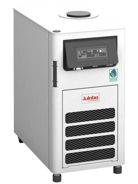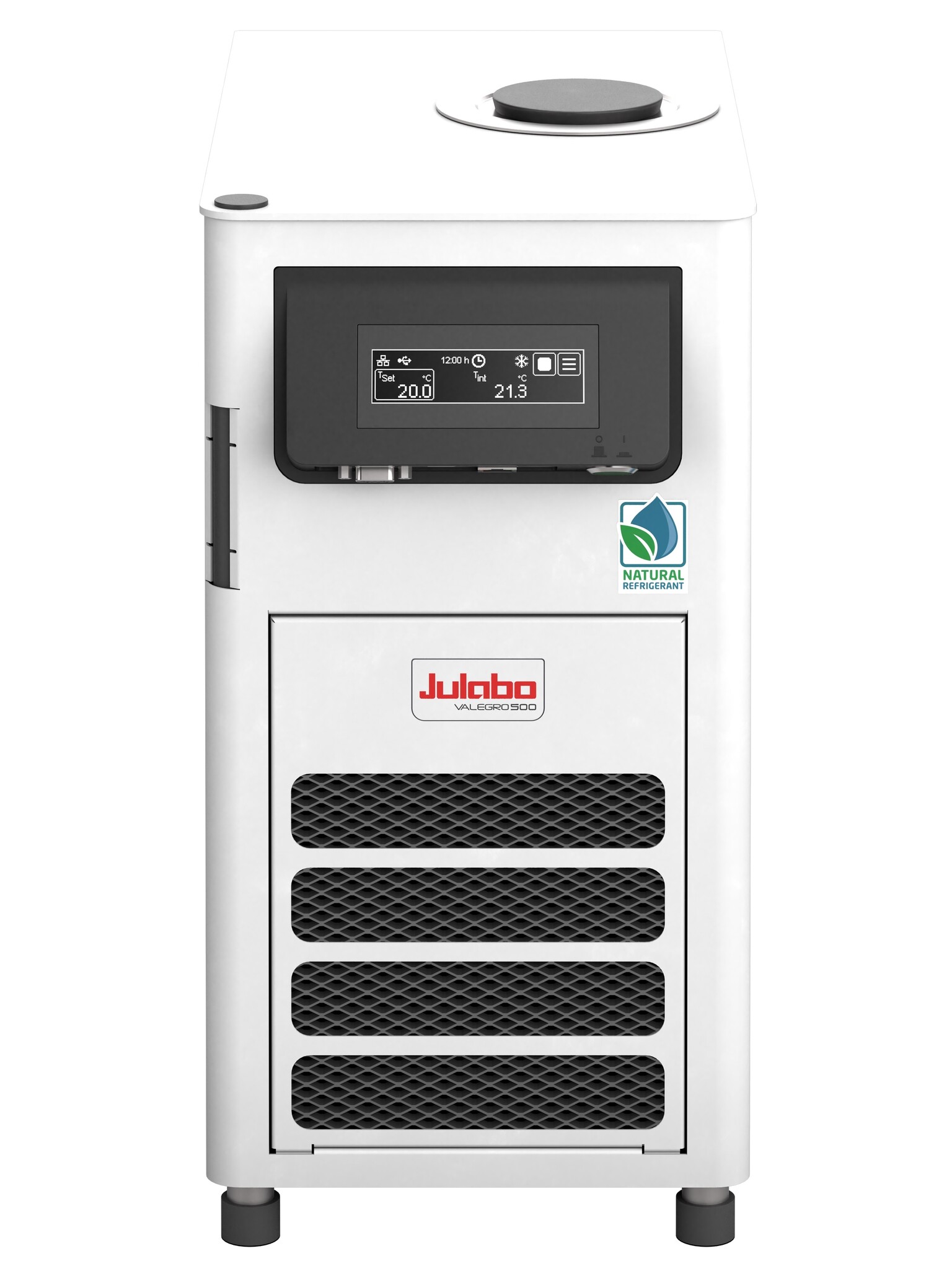 VALEGRO 500 compact recirculating chiller with -20…+40 °C operating range and 500W cooling power at 20 °C. The integrated pump generates a pump pressure up to 12.3 psi and 19 L/min with infinite adjustability to fit your application needs. Cooling via environmentally friendly natural refrigerant. OLED touch screen user interface with intuitive menu operation. Includes RS232 and USB-C interfaces for external communication with an option for Ethernet (part number 30004147). M16x1 male threaded pump connections with 8 and 12 mm hose barbs included.